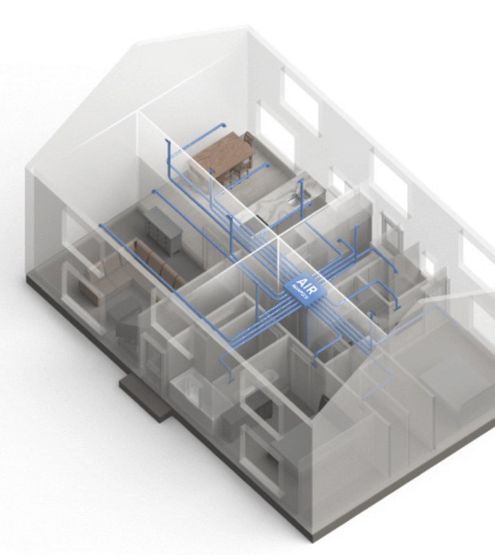 It is not uncommon to see only one or two diffusers per room in a conventional HVAC system. This creates an air mixing issue. With only one or two points of delivery in a room, conditioned air is not able to fully circulate in the room, creating ‘dead spots’ where the room will feel colder or warmer. This is exacerbated by the location of the supply to the return in a room. The return can also prevent the conditioned air from adequately circulating before exiting through the return. Rheia’s approach is different. Using smaller ducts requires more ducts per room, which can deliver air from several points in the room promoting better air mixing; improving comfort by reducing the potential for hot and cold spots.